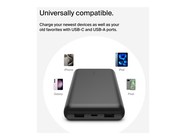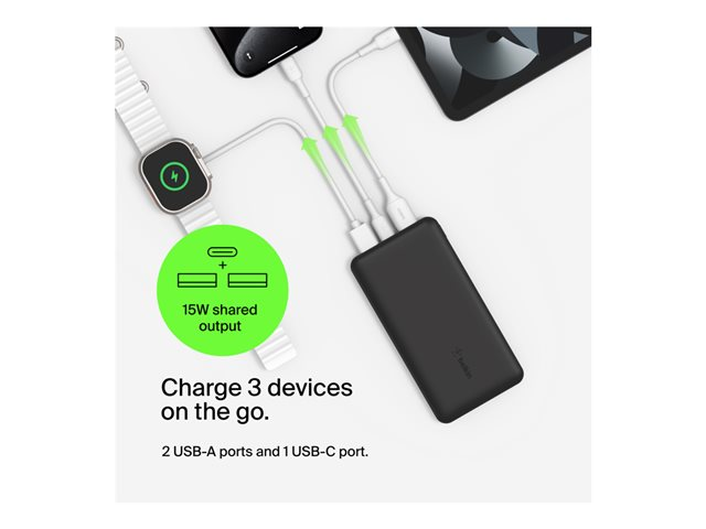 Belkin BoostCharge - Virtapankki - 20000 mAh - 15 watti(a) - 3 A - 3 lähtöliittimet (24 pin USB-C, 2 x USB) - johdossa: USB-C - musta