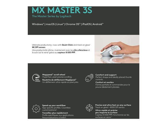 | Ominaisuudet | Peukalopyörä, eletoiminto, ladattava akku, Quiet Clicks -tekniikka, MagSpeed-vieritys, muokattava DPI, Logitech Darkfield Laser Tracking, Easy-Switch -tekniikka, peukalotuki |