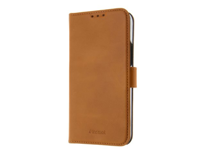 Insmat Exclusive Flip Case - Läppäkansi matkapuhelimelle - aito nahka, polykarbonaatti, puuvillaompeleet, pahvi + paperi - ruskea malleihin Apple iPhone 14 Pro 650-3115